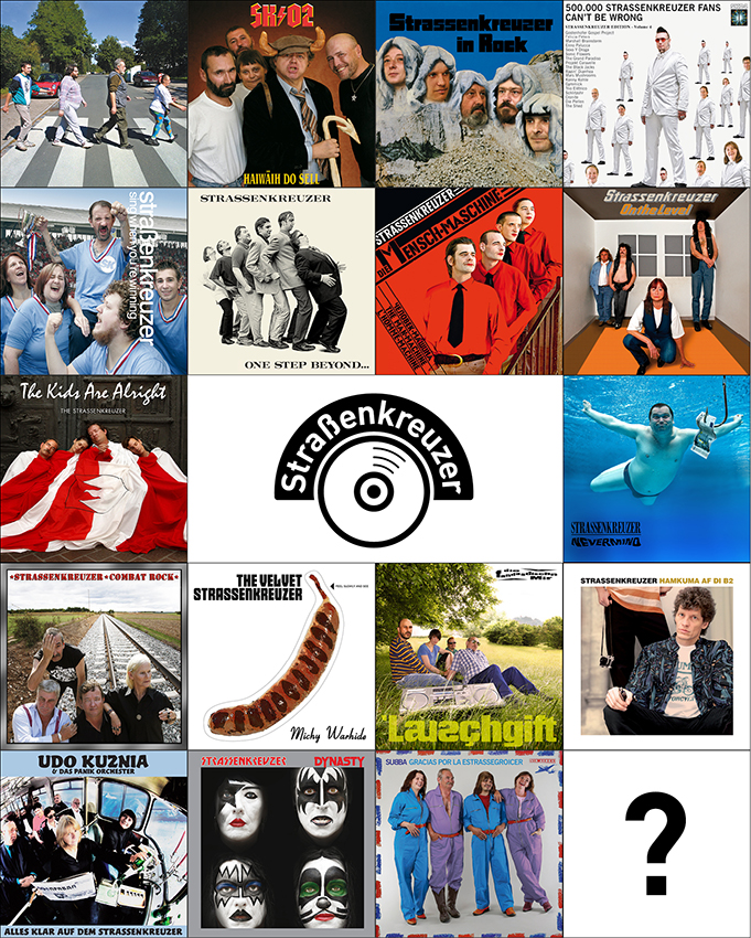 So schritten gleich zu Beginn im Jahr 2002 Serkan Cakmak, Udo Kuznia, Klaus-Bartsch und Ingrid Gutmann in bestem beatles’schen Gänsemarsch über den berühmten Zebrastreifen – und gaben damit den Startschuss zur bis heute zentralen Tradition, in der von AC/DC über Kiss, Abba, Deep Purple, Madness, Kraftwerk, The Who, Nirvana, Elvis Presley, Udo Lindenberg bis Robbie Williams und den Fantastischen Vier schon schabloniert wurden. Denn es sind stets die Verkäuferinnen und Verkäufer des Straßenkreuzers, die dem Cover in altem Motiv ein neues Gesicht verleihen und damit gewissermaßen Ahnengalerie und Hall of Fame gleichermaßen bilden.